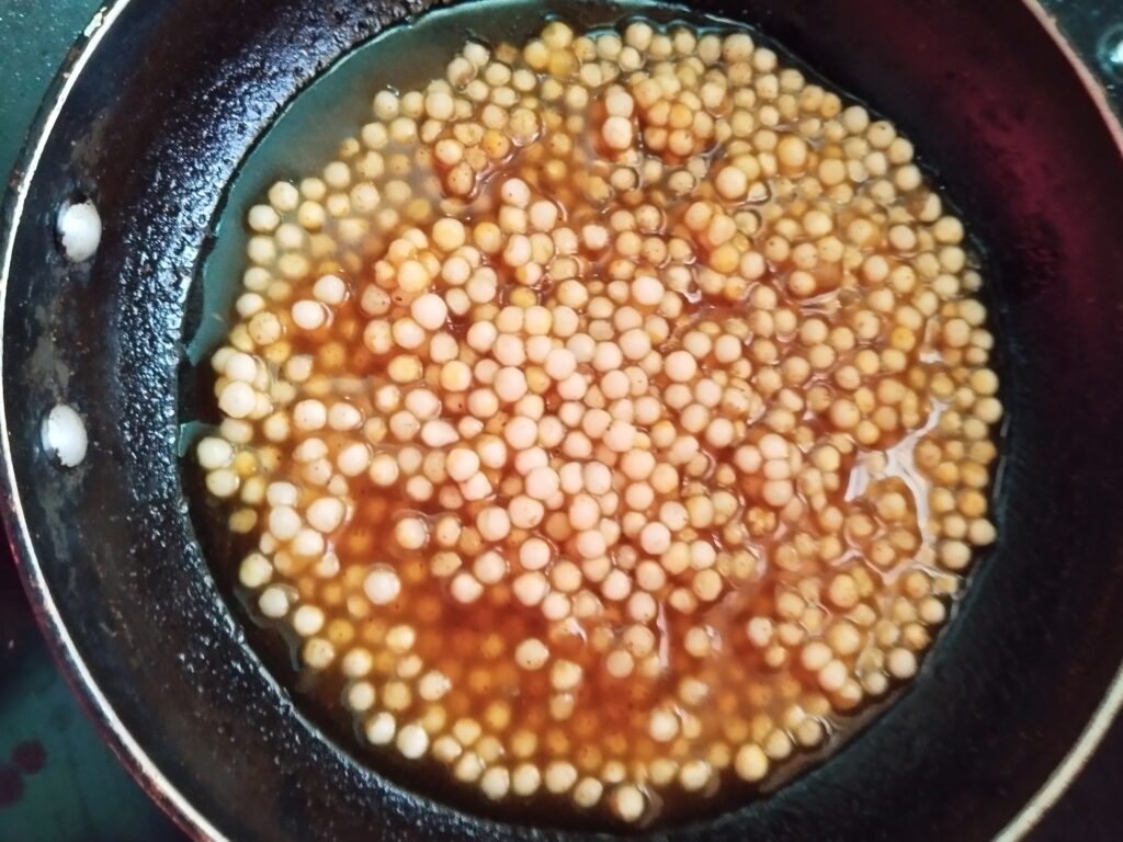I first fried a bit of the sabudana in a frying pan. I then added chilli powder. Then tried to cook it with some water. And finally, I added the jaggery.